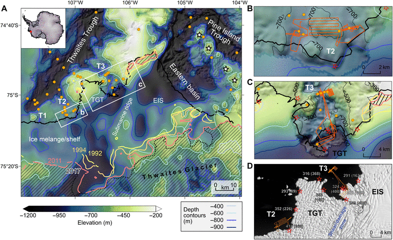 The last 25 years of satellite observations are too short to determine how Thwaites Glacier responds to ocean and atmosphere changes. Records from the pre-satellite era are required to build a holistic understanding of the glacier’s longer-term history and sensitivity to processes. Seafloor sediments deposited at the retreating grounding line and further offshore are archives of changes in the glacier and the surrounding ocean. Understanding of topography of the seafloor and how it influences ocean circulation near Thwaites Glacier is also needed to assess the stability of the glacier. Consequently, this project focuses on the seafloor, offshore from Thwaites Glacier, and the history of past glacial and ocean change. Uncertainty in model projections of the future of Thwaites Glacier will be significantly reduced by cross-disciplinary investigations seaward of the current grounding line.